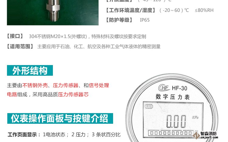 數(shù)字壓力表量程0-20MPa,精度0.4級測試消火栓用30. 細水霧末端試水裝置壓力表量程:0MPa~0.6MPa;精度:0.4級安裝在系統(tǒng)管網或分區(qū)管網的末端,檢驗系統(tǒng)啟動。