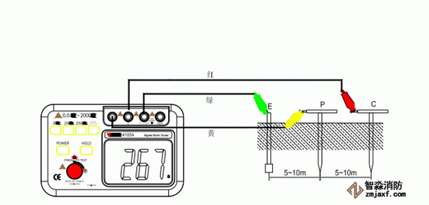 如下圖所示,將輔助接地棒P及C相距被測(cè)接地物間隔5至10米處以直線打入地下,將綠色線連接至儀器端子E,黃色導(dǎo)線連接至端子P及紅色導(dǎo)線連接至端子C。
