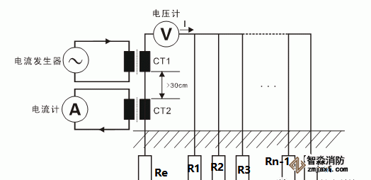 雙鉗法測(cè)量接地電阻值(適用于多獨(dú)立點(diǎn)并聯(lián)接地系統(tǒng)不打輔助地樁測(cè)量),通過(guò)激勵(lì)鉗CT1產(chǎn)生一個(gè)交流電動(dòng)勢(shì)V,在交流電動(dòng)勢(shì)V的作用下在回路中產(chǎn)生電流I,再通過(guò)CT2檢測(cè)到反饋的電流I,并根據(jù)公式R=V/I計(jì)算出電阻值,圖中R=Re+R1//R2//R3//…Rn-1//Rn,當(dāng)R1//R2//R3//…Rn-1//Rn(多個(gè)接地點(diǎn)并聯(lián)后的阻值)遠(yuǎn)小于Re,有R≈Re。