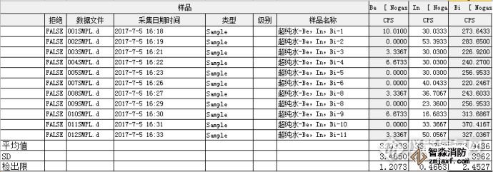 以18M Ω.cm的超純水進(jìn)樣,測(cè)量測(cè)量質(zhì)量數(shù)9,115,209處的離子計(jì)數(shù),積分時(shí)間0.1s,分別測(cè)量11個(gè)數(shù)據(jù),用測(cè)量結(jié)果的標(biāo)準(zhǔn)偏差SA的3倍除以Be、In、Bi的寧明的S,結(jié)果即為各元素的檢出限,CL=3SA/S。