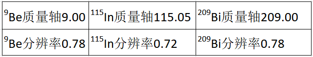質(zhì)量軸:以1×10-2 mg/L Be、In、Bi、混合溶液進(jìn)樣,打印質(zhì)量數(shù)9,115,209的譜圖