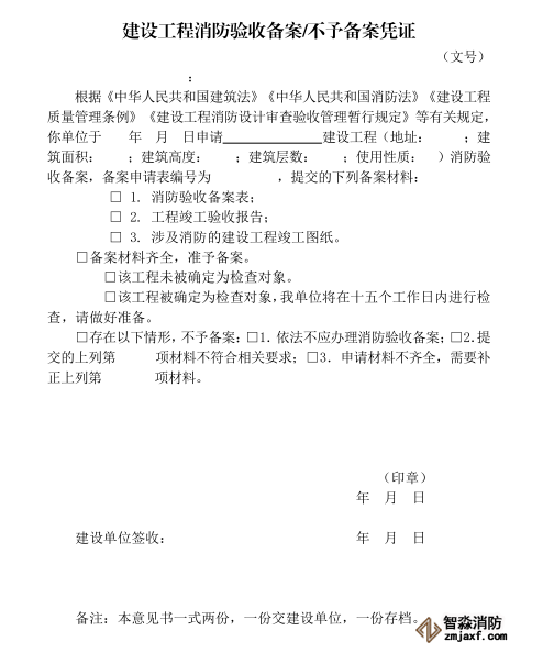 第三十五條 消防設計審查驗收主管部門收到建設單位備案材料后,對備案材料齊全的,應當出具備案憑證;備案材料不齊全的,應當一次性告知需要補正的全部內容。