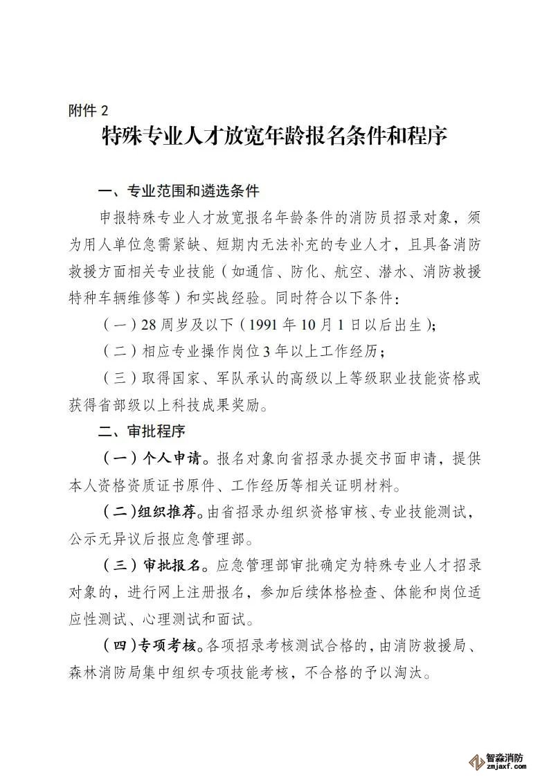 申請(qǐng)?zhí)厥鈱I(yè)人才放寬年齡報(bào)名的,由本人于9月10日前(以信件寄出郵戳?xí)r間為準(zhǔn))向省級(jí)消防員招錄工作辦公室(以下簡(jiǎn)稱“省級(jí)招錄辦”)寄送書面申請(qǐng)和相關(guān)證件證書復(fù)印件,經(jīng)省級(jí)招錄辦組織審核、公示并報(bào)應(yīng)急管理部審批同意后,辦理網(wǎng)上注冊(cè)報(bào)名。標(biāo)準(zhǔn)條件和辦理程序見附件2。