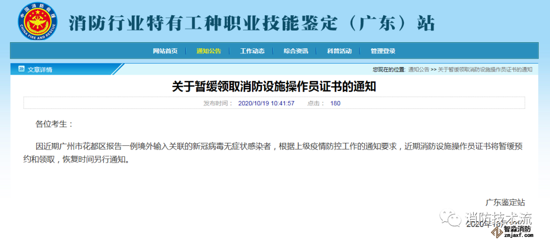 因近期廣州市花都區報告一例境外輸入關聯的新冠病毒無癥狀感染者,根據上級疫情防控工作的通知要求,近期消防設施操作員證書將暫緩預約和領取,恢復時間另行通知。